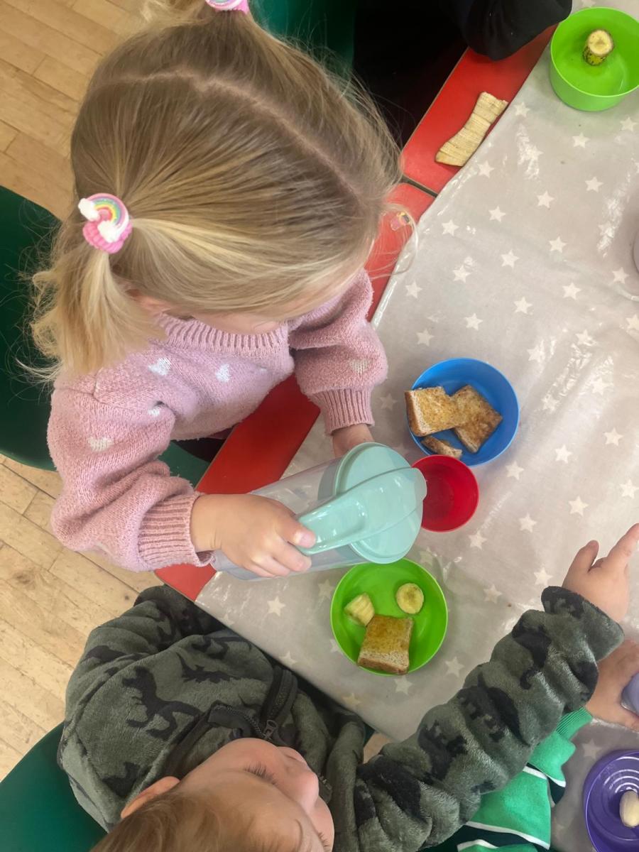 During each session we provide a healthy snack that might be crackers, breadsticks, toast or bread and butter with some fruit or vegetable pieces and a drink of milk or water. The children serve themselves from our snack bar and sit at a table with an adult close by. This is an important time for learning new skills and remembering manners. In addition, there is water freely available to children throughout their session. Please let us know if your child has any allergies.
